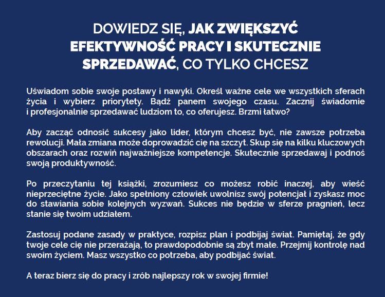 Jeżeli szukasz praktycznego podręcznika, który pomoże Ci zrozumieć jak pracować efektywnie oraz udzieli wskazówek, w jaki sposób skutecznie przygotować się do sprzedaży, to zdecydowanie ta książka jest dla Ciebie.